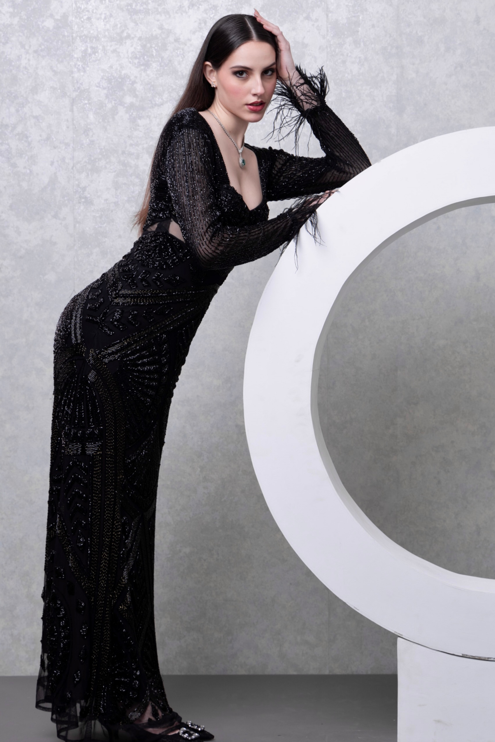 Indulge in opulence with this exquisite black embellished gown featuring sumptuous fur cuffs. The gown's intricate embellishments exude timeless elegance, while the fur cuffs add a touch of luxury and sophistication. Perfect for glamorous events or formal affairs, this ensemble promises to command attention and leave a lasting impression with its blend of refinement and allure