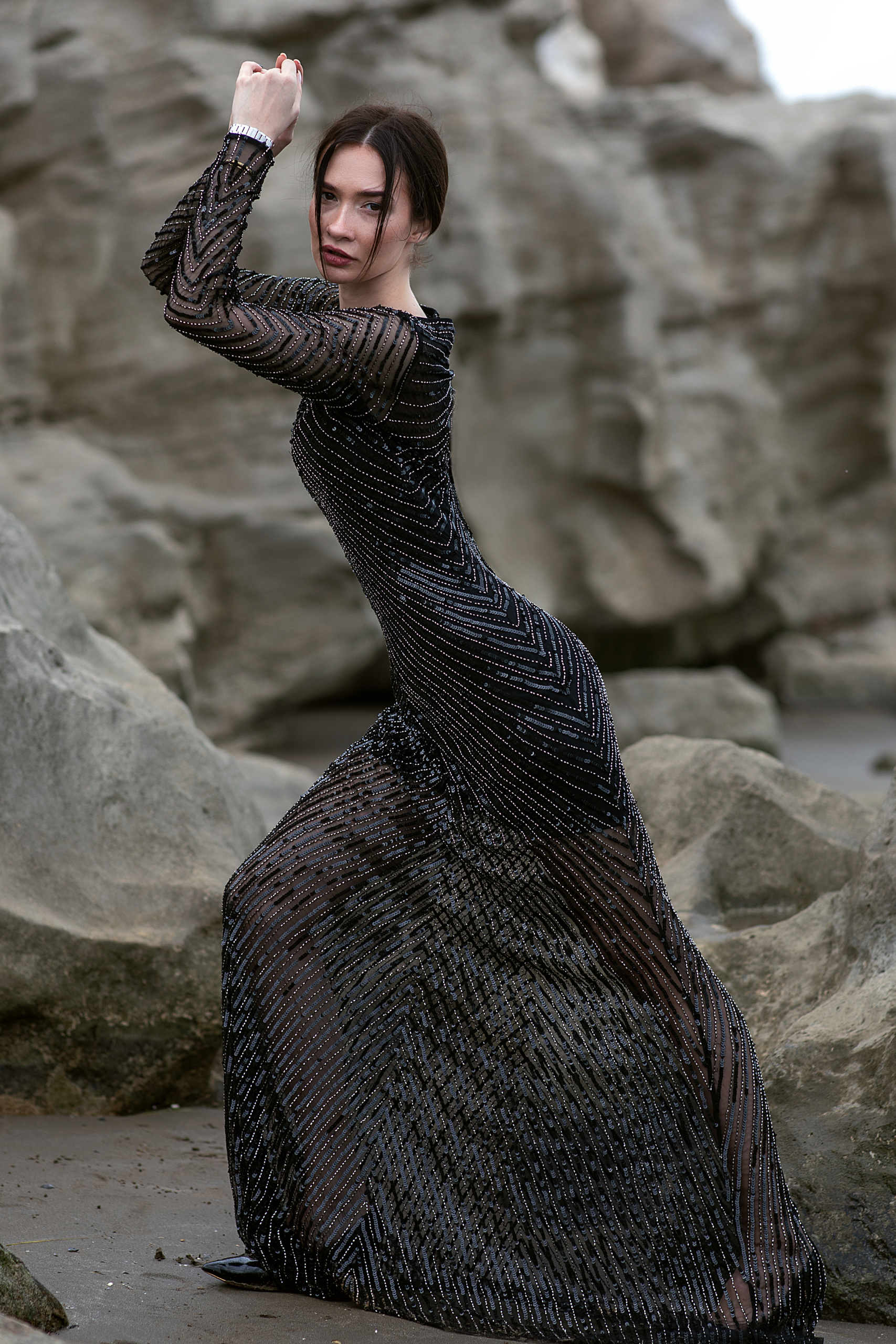 Unveil timeless allure in our black fitted gown, where sophistication meets intrigue. With sheer detailing from the bottom, this piece is adorned with handcrafted embellishments that elevate its elegance, ensuring you make an unforgettable statement.