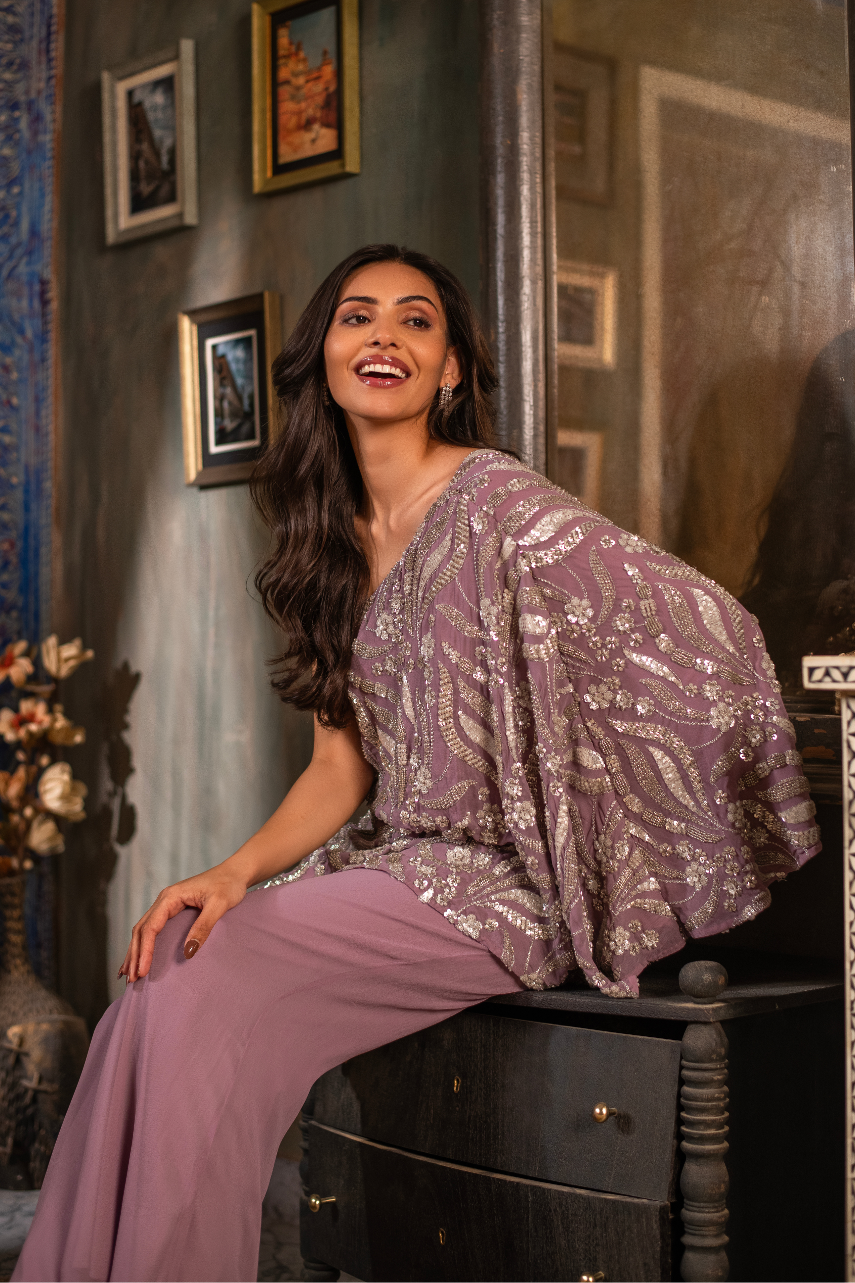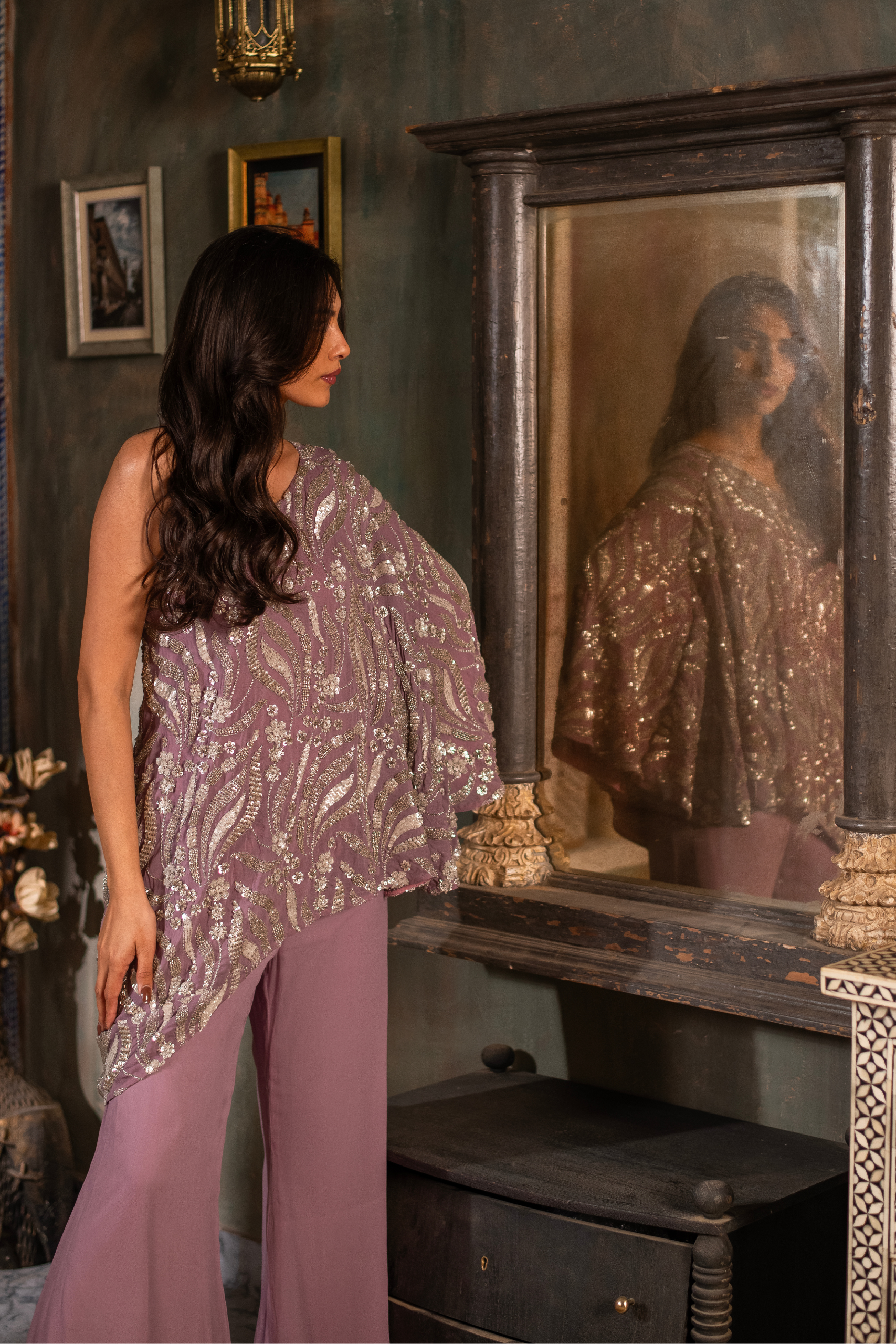 Glow in the Lilac Purple Sequence Co-ord Set, crafted from soft Viscose GGT and flowing Polycrepe fabric. Designed with a secure zip and hook & eye closure for a perfect fit. Adorned with sparkling sequence, cut dana, and moti embellishments for a glamorous touch. Ideal for festive events or parties, blending elegance with contemporary style.