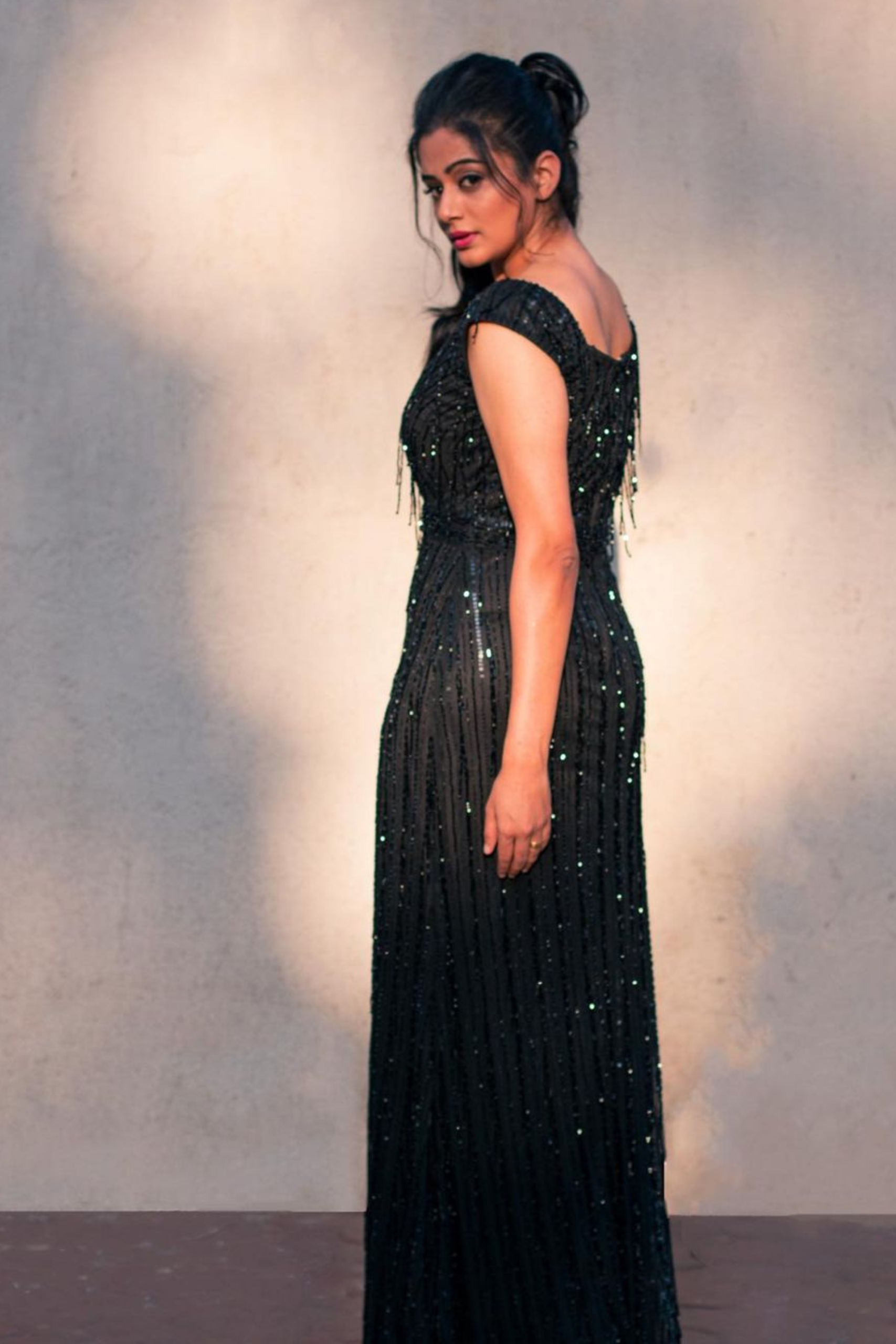 Elevate your evening style with this stunning black gown featuring vertical sequin embellishments that shimmer with every move. The plunging neckline is tastefully balanced with a sheer mesh insert, while delicate fringe-style beading on the sleeves adds a playful touch. Sophisticated, sleek, and statement-worthy — perfect for cocktail parties, receptions, or glamorous night-outs.