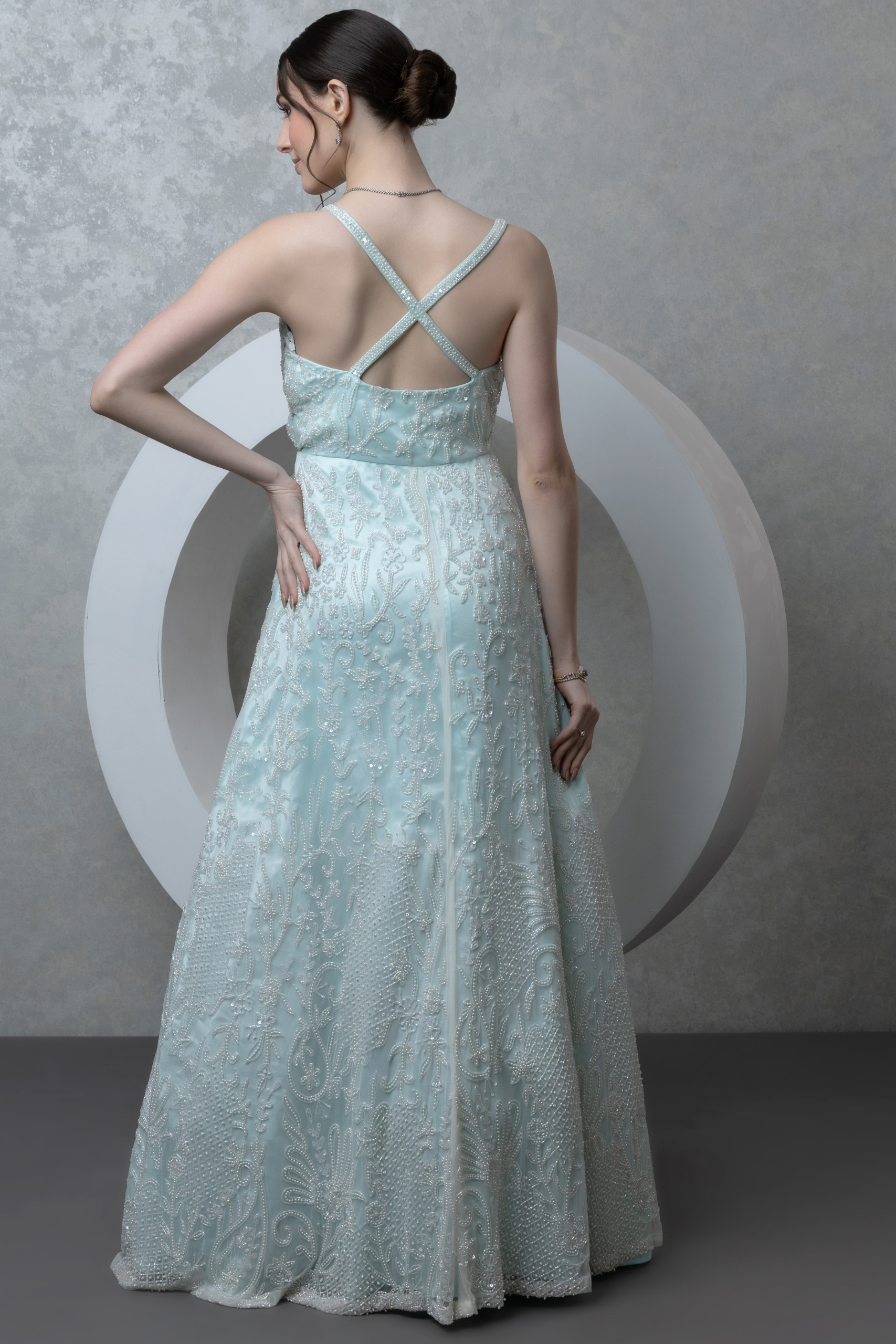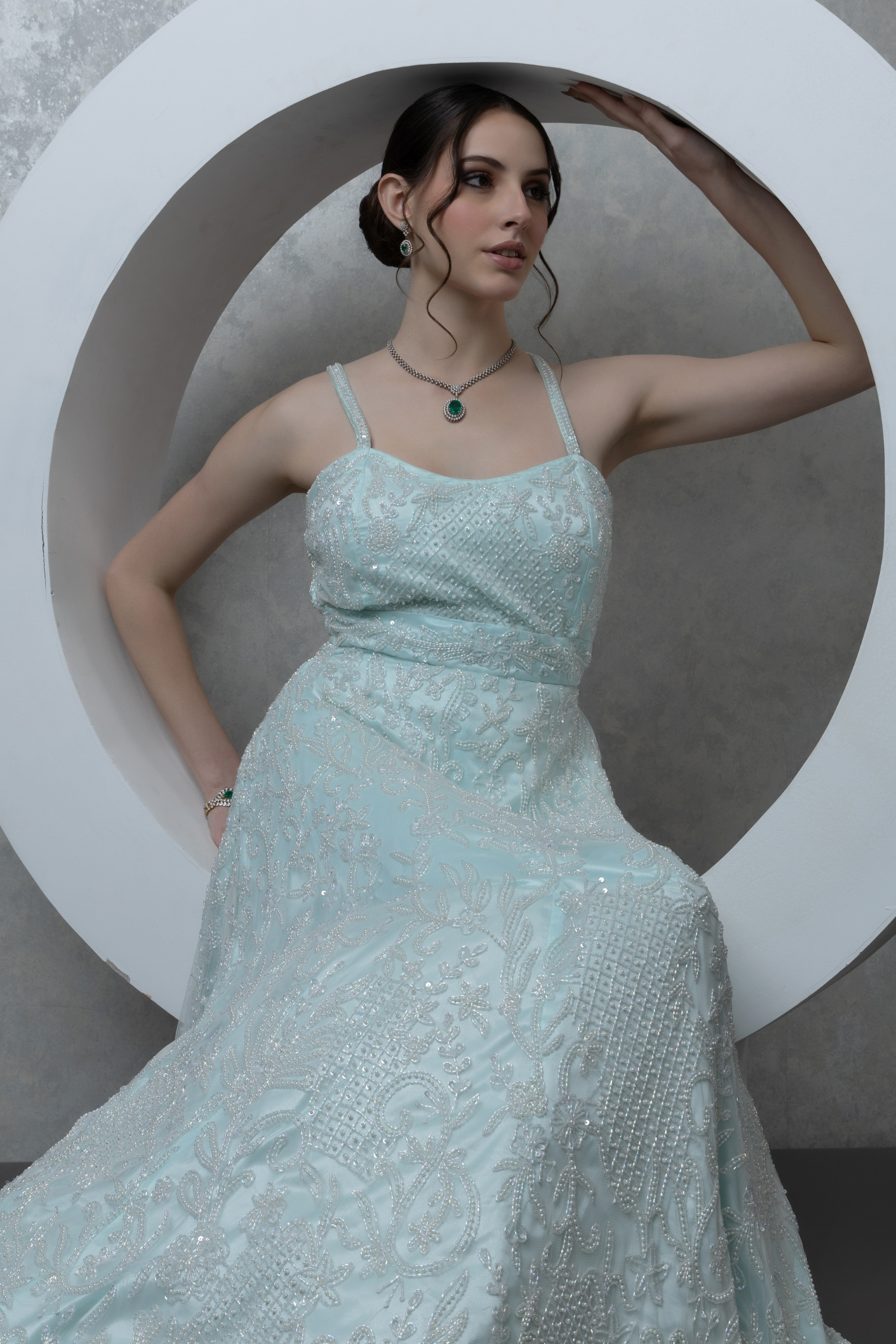 Dive into elegance with this enchanting sea blue flared gown. The flowing silhouette cascades gracefully, evoking the tranquility of ocean waves. Its captivating hue captures the essence of serene waters, while the flared design adds a touch of whimsy and movement. Perfect for special occasions, this gown promises to make waves with its timeless beauty and charm.