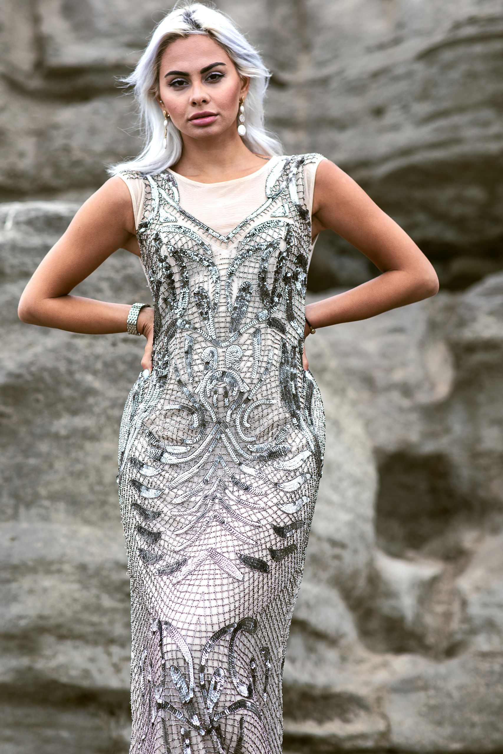 Embrace understated luxury in our silver and grey embellished fitted gown. This exquisite piece effortlessly merges elegance and allure, ensuring you shine with a refined and captivating charm.