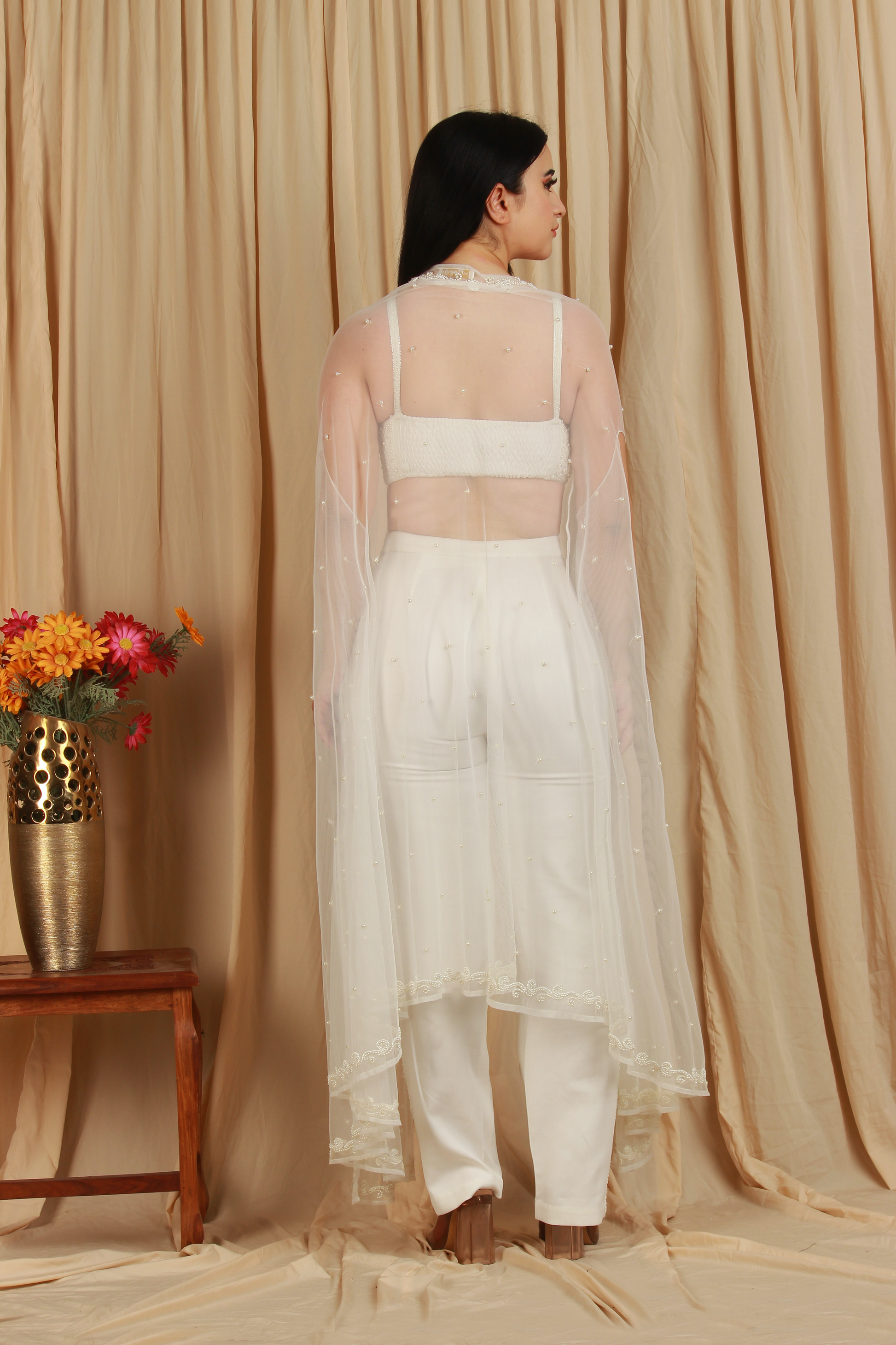 Step into elegance with this white co-ord set featuring a delicately embroidered bustier and tailored pants. A sheer embroidered cape adds flow, drama, and a touch of ethereal charm. Crafted in luxe fabrics for a flattering silhouette and all-day comfort. Perfect for pre-wedding functions, cocktail events, or modern festive looks. Pair with heels and statement earrings for a show-stopping ensemble.